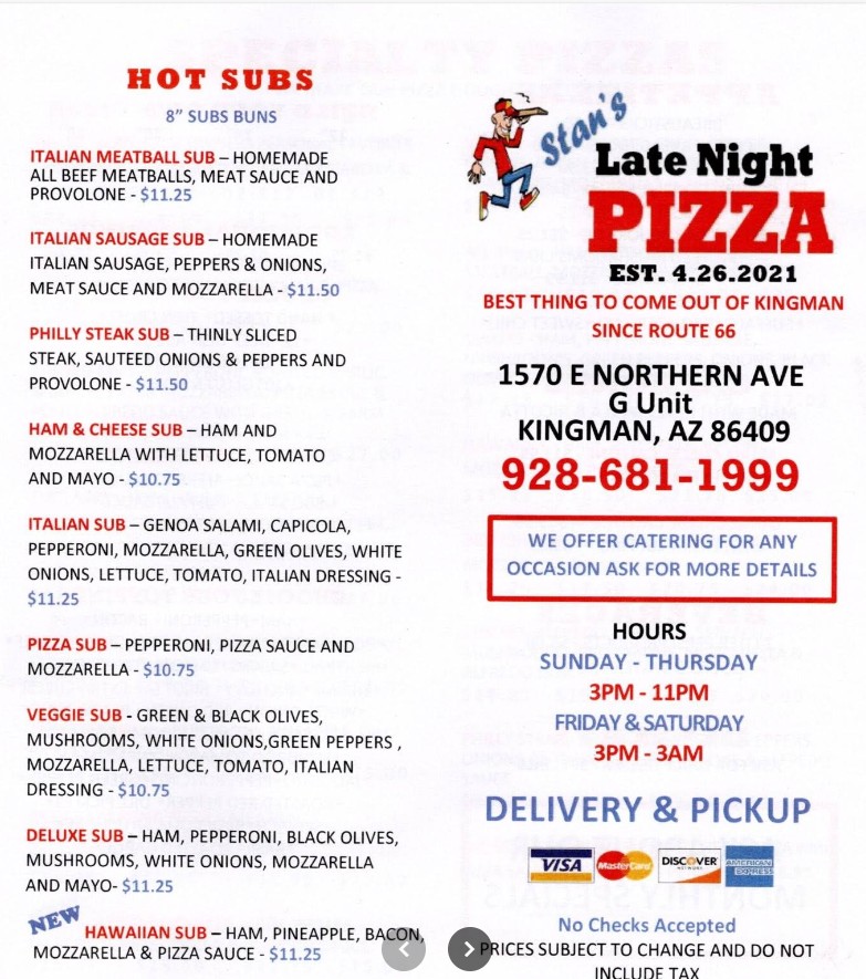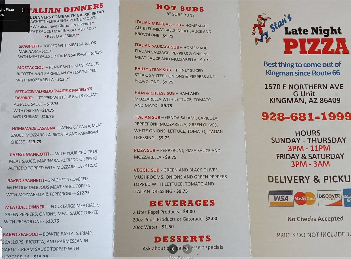 At Stan's Late Night Pizza in Kingman, Arizona, great food doesn’t stop when the sun goes down. Our menu is packed with handcrafted pizzas, crispy wings, cheesy breadsticks, and late-night favorites made to satisfy every craving. Whether you’re here for a family dinner, grabbing a quick bite, or ordering delivery after hours, the Stan's Late Night Pizza Restaurant menu has something for everyone. Taste the difference of fresh ingredients, generous toppings, and bold flavors served late into the night.